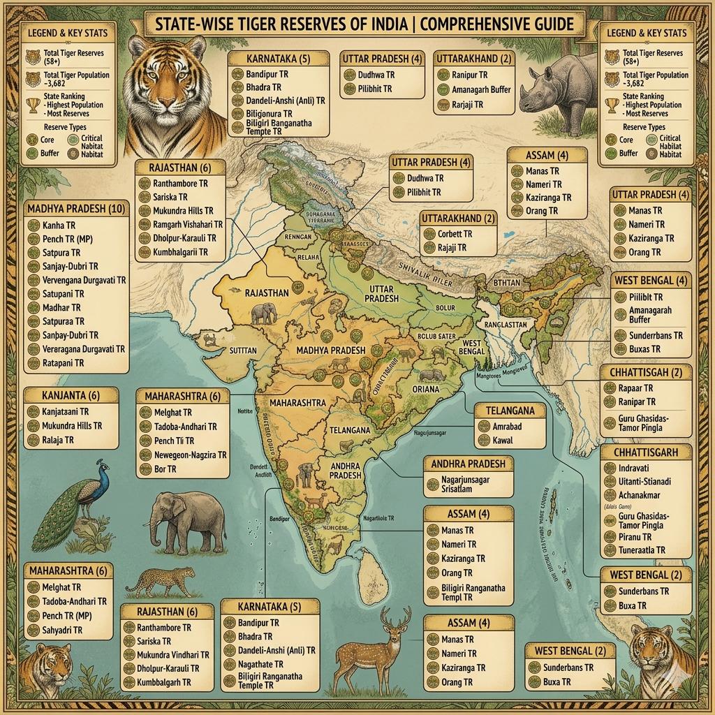 🐅 भारत के सभी टाइगर रिज़र्व – पूरी जानकारी (2026 अपडेट)भारत दुनिया में बाघों की सबसे बड़ी आबादी वाला देश है।